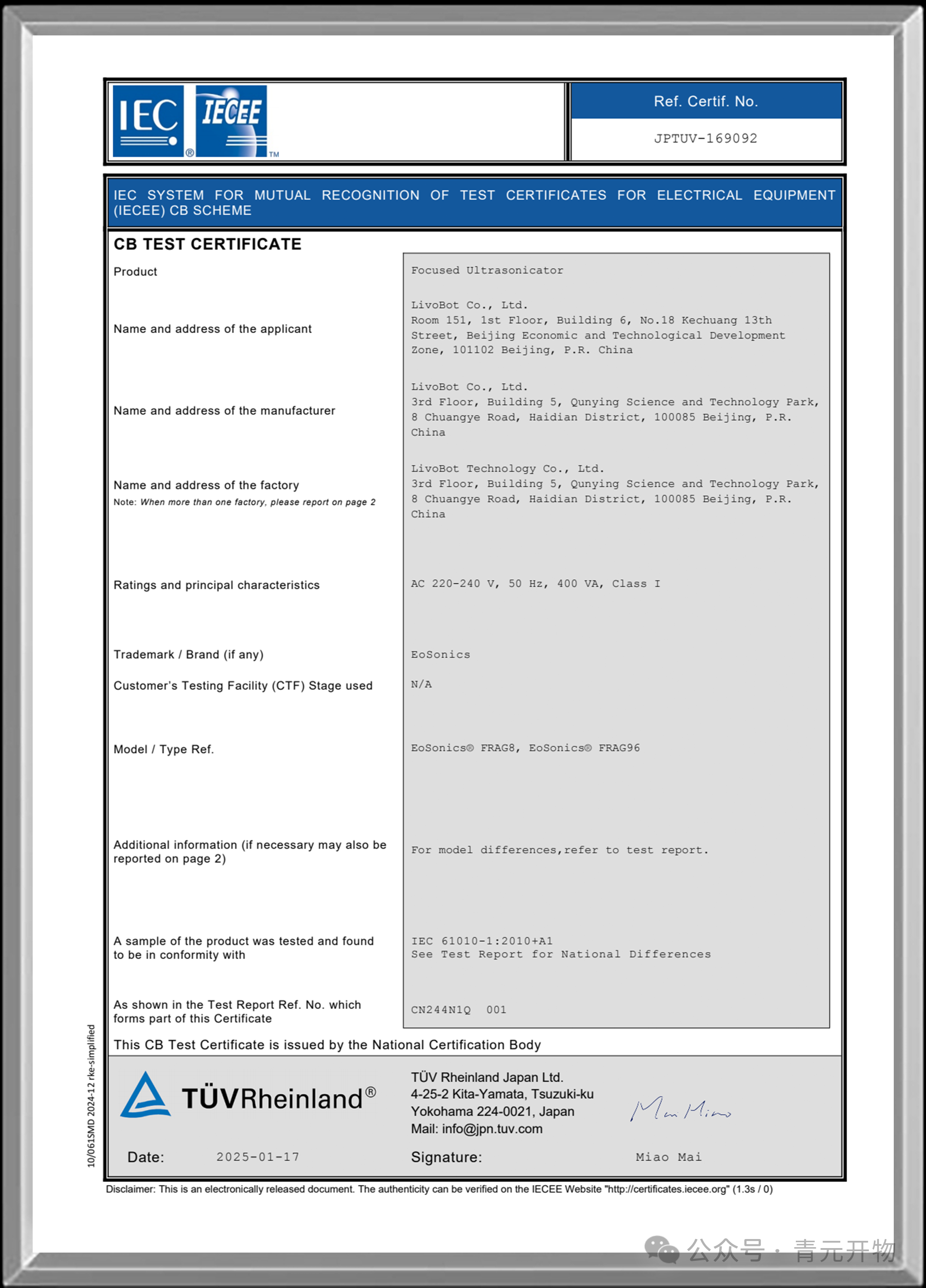 開年重磅 又添力“證”丨青元開物EoSonics? FRAG系列超聲聚焦打斷儀獲CB、CE雙重認(rèn)證