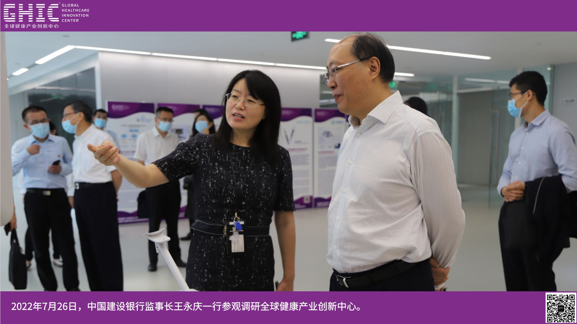 2022年7月26日,中國建設(shè)銀行監(jiān)事長王永慶一行參觀調(diào)研全球健康產(chǎn)業(yè)創(chuàng)新中心。