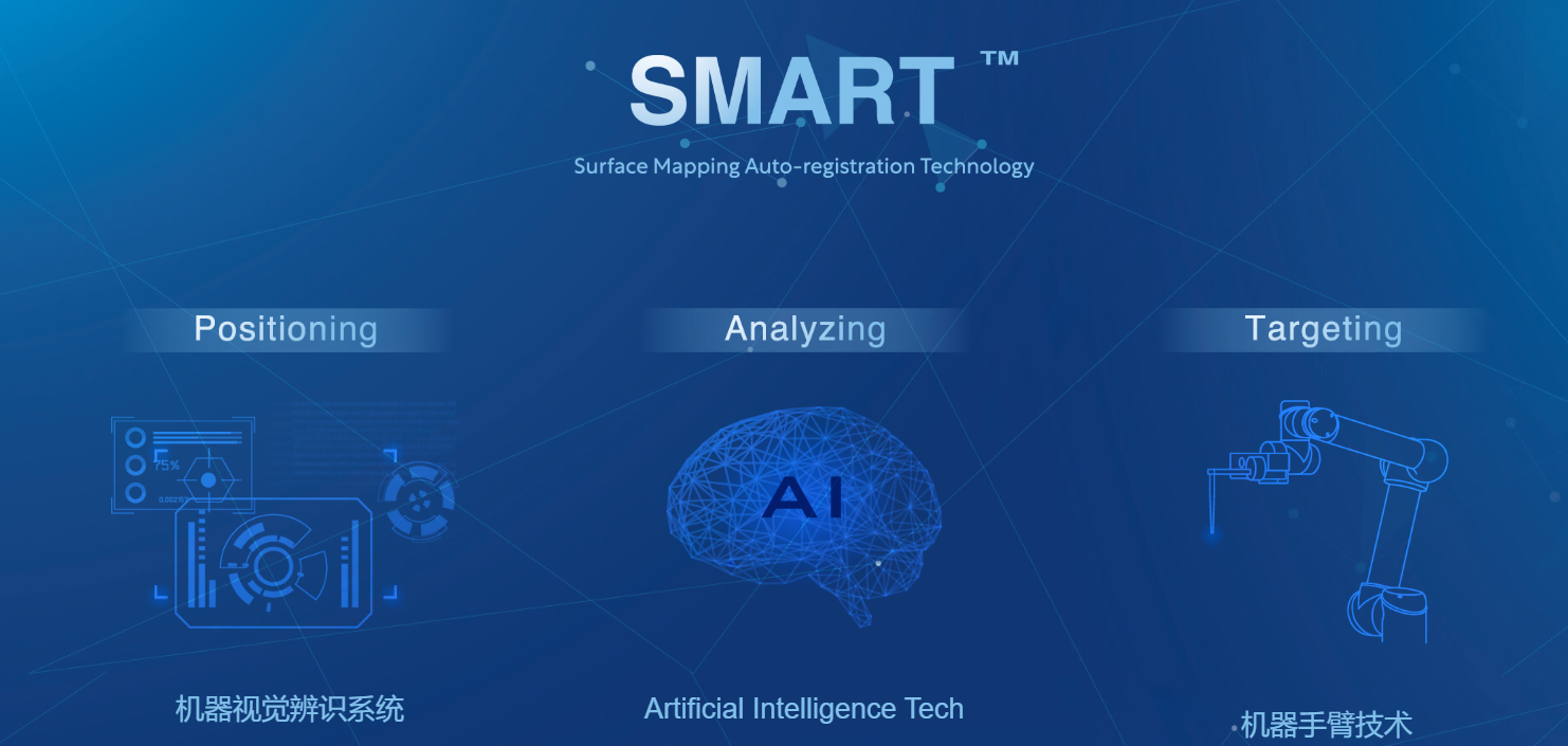 核心技術(shù)支持是 SMART(Surface Mapping Auto-registration Technology)平臺(tái),它通過結(jié)合機(jī)器視覺、機(jī)器人技術(shù)和AI技術(shù),實(shí)現(xiàn)手術(shù)中的“實(shí)時(shí)成像”、提高精確度,并讓手術(shù)更加微創(chuàng)。