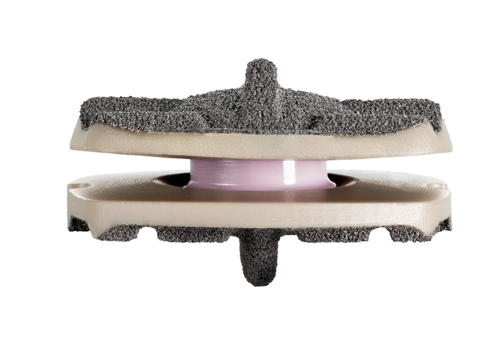 Simplify Disc 最初應(yīng)用于頸椎,后于2024年拓展至腰椎領(lǐng)域,主打單水平置換。產(chǎn)品采用三件式結(jié)構(gòu),由兩個鈦端板與中間的 PEEK 核心組成。PEEK 材料的優(yōu)勢在于減少金屬磨損顆粒、降低炎癥風(fēng)險。